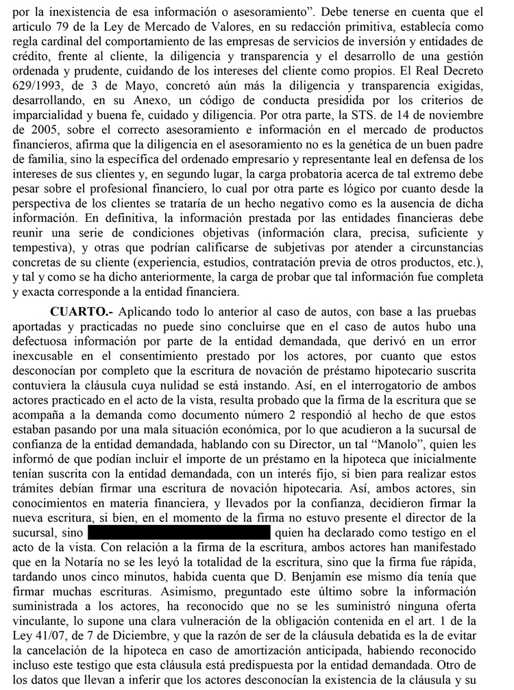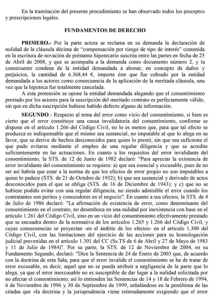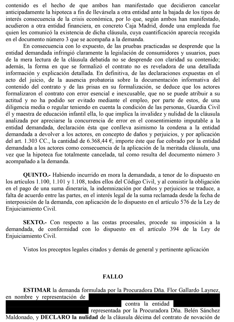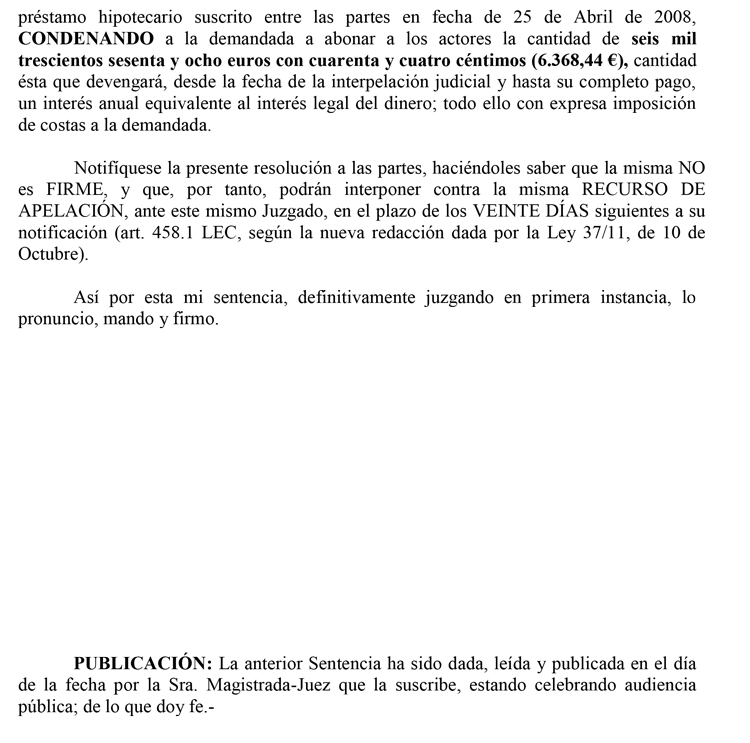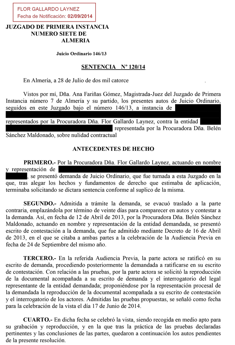 28/07/2014. Sentencia del Juzgado de 1ª Instancia nº 7 de Almería. Nulidad de Cláusula riesgo cancelación de hipoteca.Particular // Banco. Estimatoria con costas